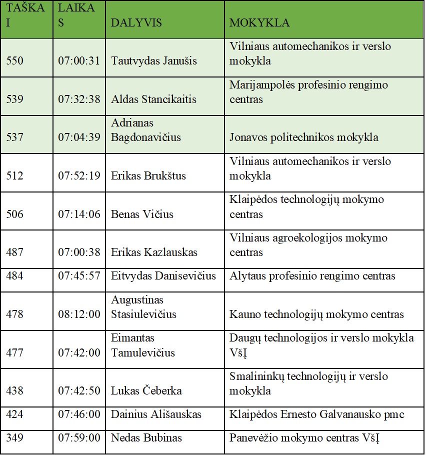 Geriausiai šįkart pasirodęs Vilniaus automechanikos ir verslo mokyklos studentas Tautvydas Janušis sugebėjo surinkti 550 balų. Jis visus pateiktus galvosūkius išsprendė beveik pusvalandžiu greičiau nei antroje vietoje likęs varžovas.
