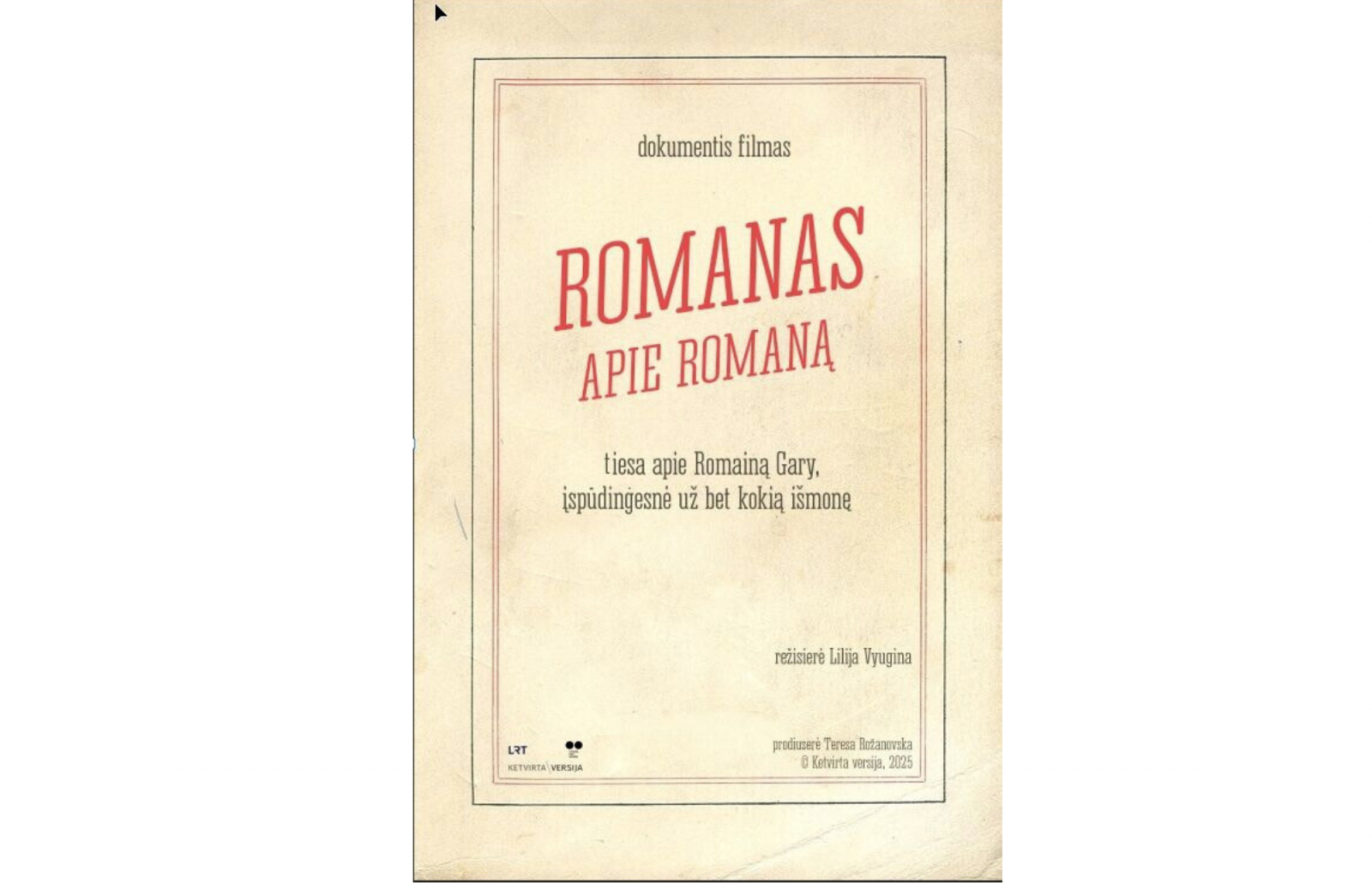 Filmo „Romanas apie Romaną" (rež. Lilija Vjugina) premjera įvyks gruodžio 17 d. 18.00 val. Lietuvos teatro, kino ir muzikos muziejuje. Kino teatruose filmas pasirodys 2026 m. Filmo gamybą rėmė Lietuvos kino centras ir LRT.