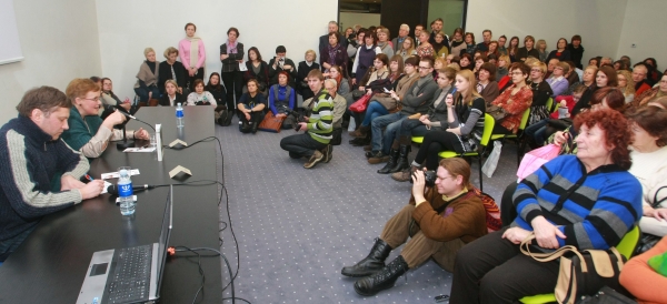 Literatūrologės Viktorijos Daujotytės knyga „Justino Marcinkevičiaus žemė/ Žmogaus šiapus“ buvo sutikta sausakimšoje knygų mugės salėje ir sulaikius kvėpavimą - matyt, šiedu vardai pasižymi ta pačia metafizika traukti žmones. Nors susitikimo pradžioje profesorė su jai būdingu kuklumu tarė suprantanti, kad visi susispietę būtent dėl Just.Marcinkevičiaus, tačiau buvo tik iš dalies teisi, - daugelis kentė grūstį, norėdami patirti jos išmintingą, tarsi glostančiu akcentu tariamą žodį.