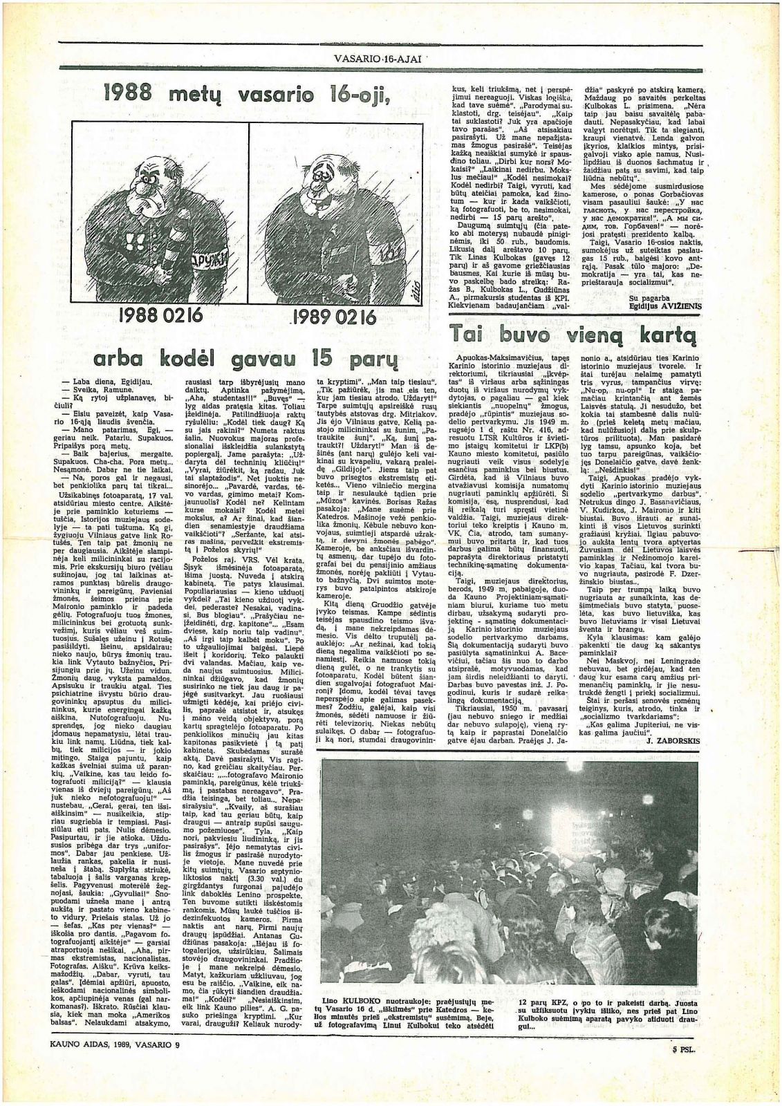 1988-02-16 už Kauno Rotušės aikštėje milicijos pareigūnų fotografavimą, prie Maironio paminklo gėles dedančius žmones ir neva triukšmo kėlimą bei draugovininkų ir tų pačių milicininkų stumdymą aš buvau nuteistas 15-a parų arešto. Mano įkalinimo terminas baigėsi kovo 2-osios vėlų vakarą, vidurnakčio diapazone.