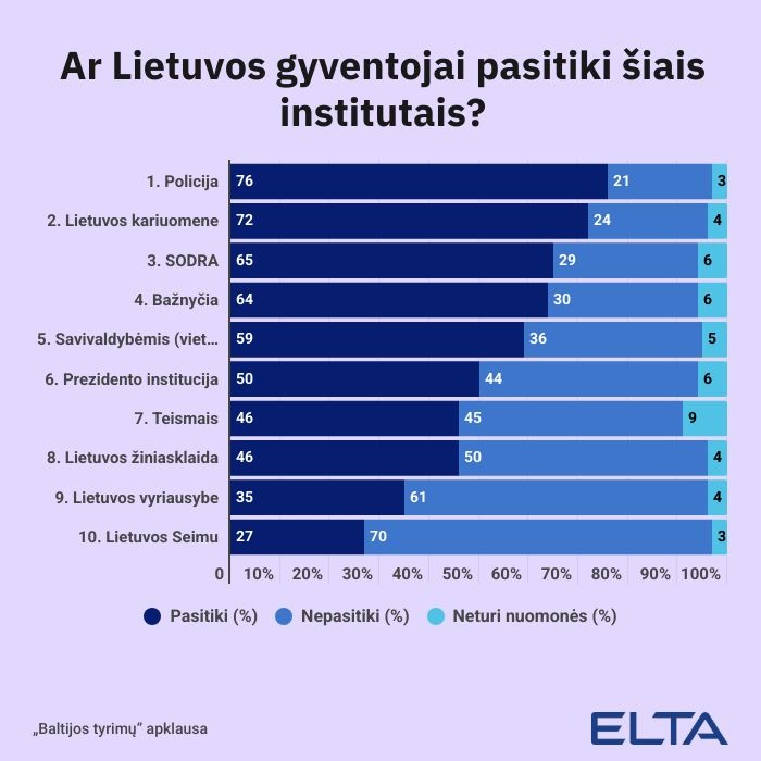 Tarp šalies institucijų gyventojai ir toliau labiausiai pasitiki Lietuvos policija bei kariuomene, mažiausiai – Seimu ir Vyriausybe, tuo metu pasitikėjimo Lietuvos teismais rodikliai vasarį – geriausi per septynerius metus, rodo naujausia Eltos užsakymu atlikta „Baltijos tyrimų“ apklausa.