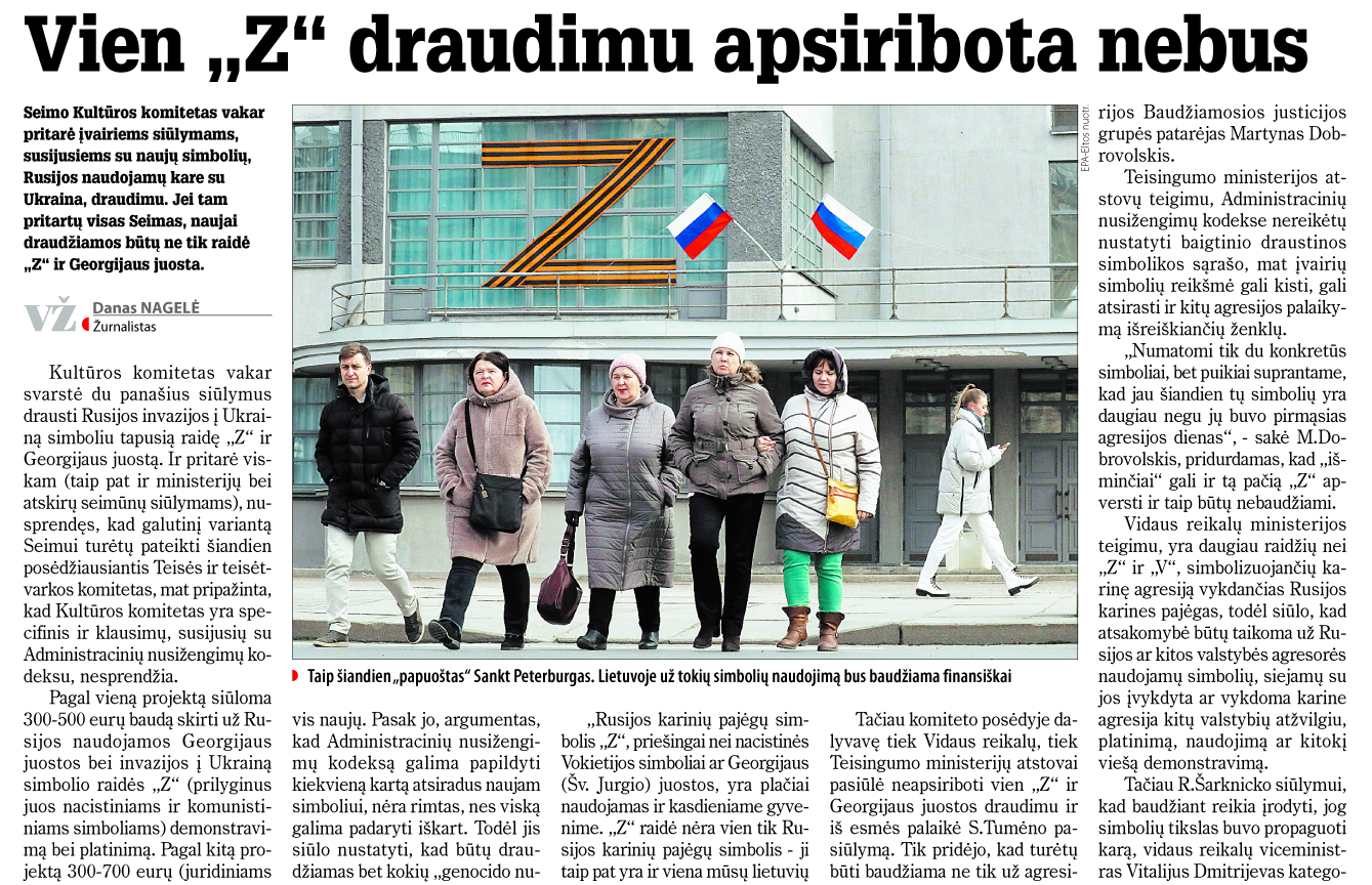 „Vakaro žinios" šią savaitę rašė, kad Seimo Kultūros komitetas pritarė įvairiems siūlymams, susijusiems su naujų draustinų simbolių, Rusijos naudojamų kare su Ukraina, draudimu. Jei tam pritartų visas Seimas, naujai draudžiamos būtų ne tik raidė „Z", „V" ir Georgijaus juostelė. Šis straipsnis portale respublika.lt sulaukė daugybės komentarų.