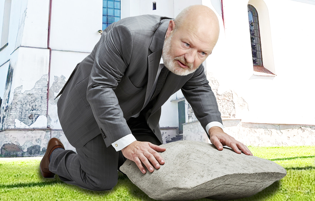 Gentvilas nenusileido kolegei išradingumu ir prisiminė, kad prie Simno bažnyčios yra nuodėmių atleidimo akmuo. Jei nusidėjai, atsiklaupi ir galva daužai tą akmenį.