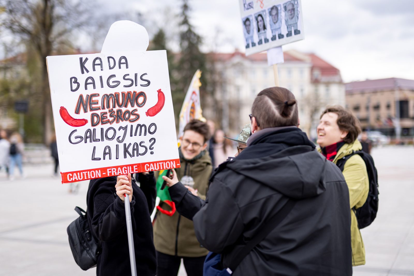 Susirinkusių rankose - plakatai „Šalin rankas nuo laisvo žodžio", „Važiavau 300 kilometrų, kad ir vėl stovėčiau", „Kada baigsis „Nemuno dešros" galiojimo laikas?", taip pat Lietuvos ir šalies miestų, Ukrainos vėliavos. Dalyje plakatų vaizduojami valdančiųjų atstovai, pavyzdžiui, Seimo pirmininkas Juozas Olekas bei „aušriečių" lyderis Remigijus Žemaitaitis.