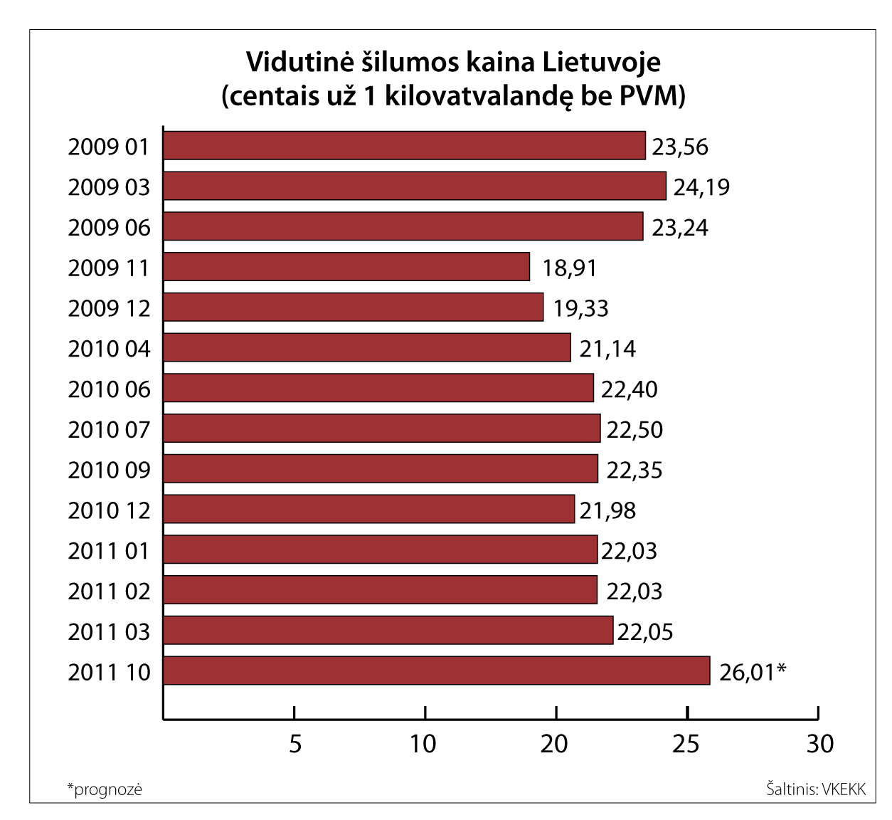 Prognozuojama, kad labiausiai šilumos kainos turėtų šoktelėti Vilniuje - maždaug 22 proc. (nuo 23 centų už kilovatvalandę (ct/kWh) iki 28,08 ct/kWh). Kaune išaugus dujų kainoms šiluma turėtų brangti 16 proc. (nuo 25,66 iki 29,73 ct/kWh), Klaipėdoje - 15 proc. (nuo 22,54 iki 25,97 ct/kW).