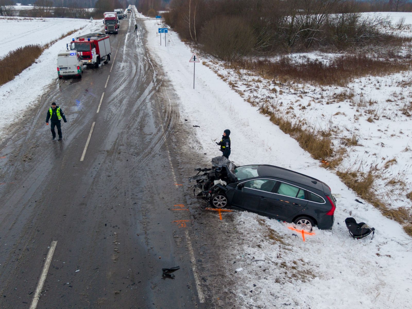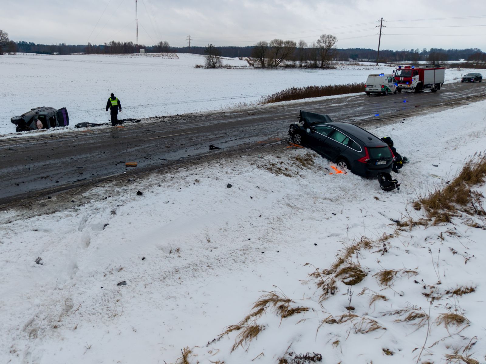 Pirminiais duomenimis, įtariama, kad avarija įvyko, kai automobilis „Volvo" išvažiavo į priešpriešinę eismo juostą.