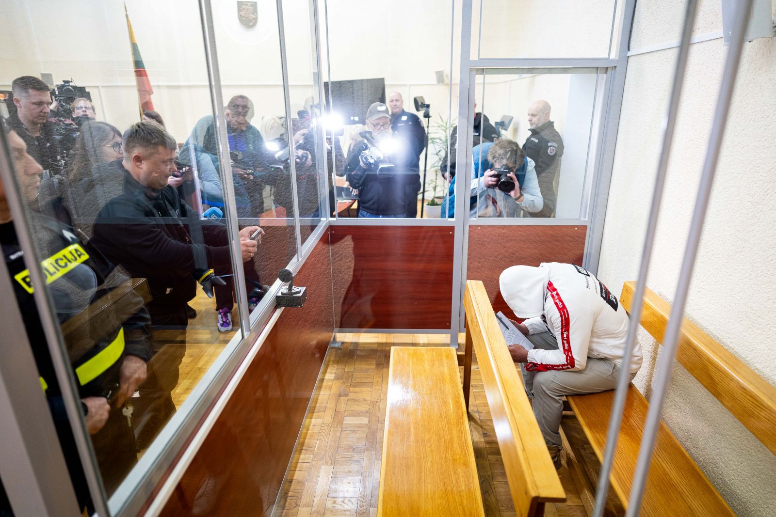 Kiek vėliau į teismą buvo atvežtas kitas įtariamasis byloje. Jis taip pat dengėsi veidą, nebendravo su žiniasklaidos atstovais.
