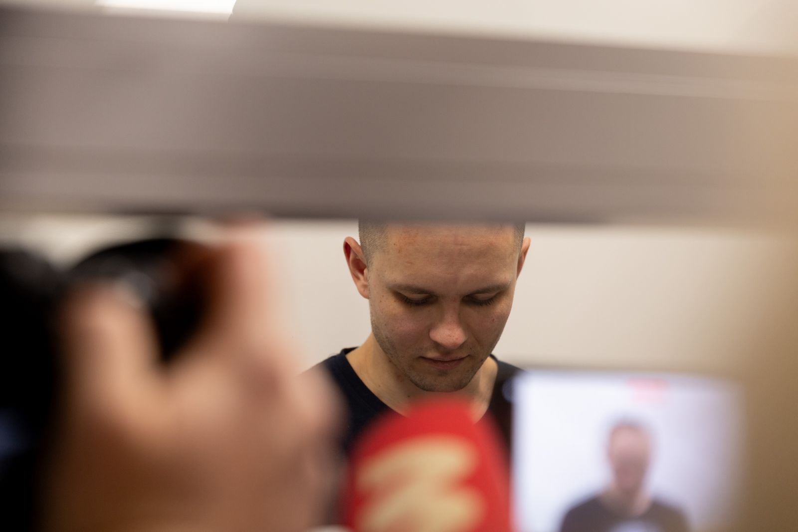 Vyrą atlydėjo būrys ginkluotų policijos pareigūnų, į teismo pastatą vedamas įtariamasis nesislėpė, jis neatsakė į žurnalistės klausimą, kodėl taip pasielgė. Jo rankos iš priekio buvo surakintos antrankiais.