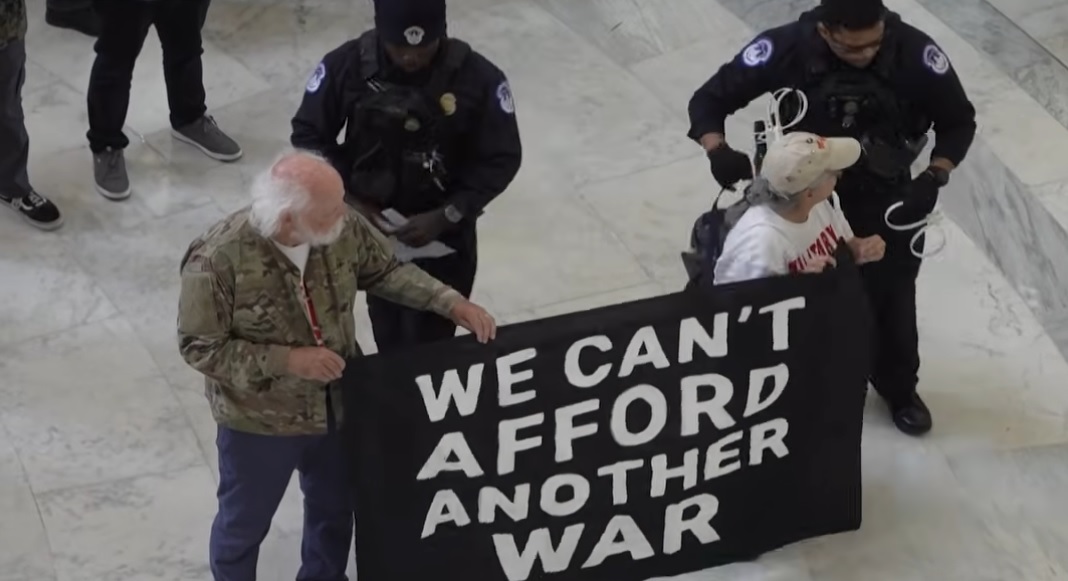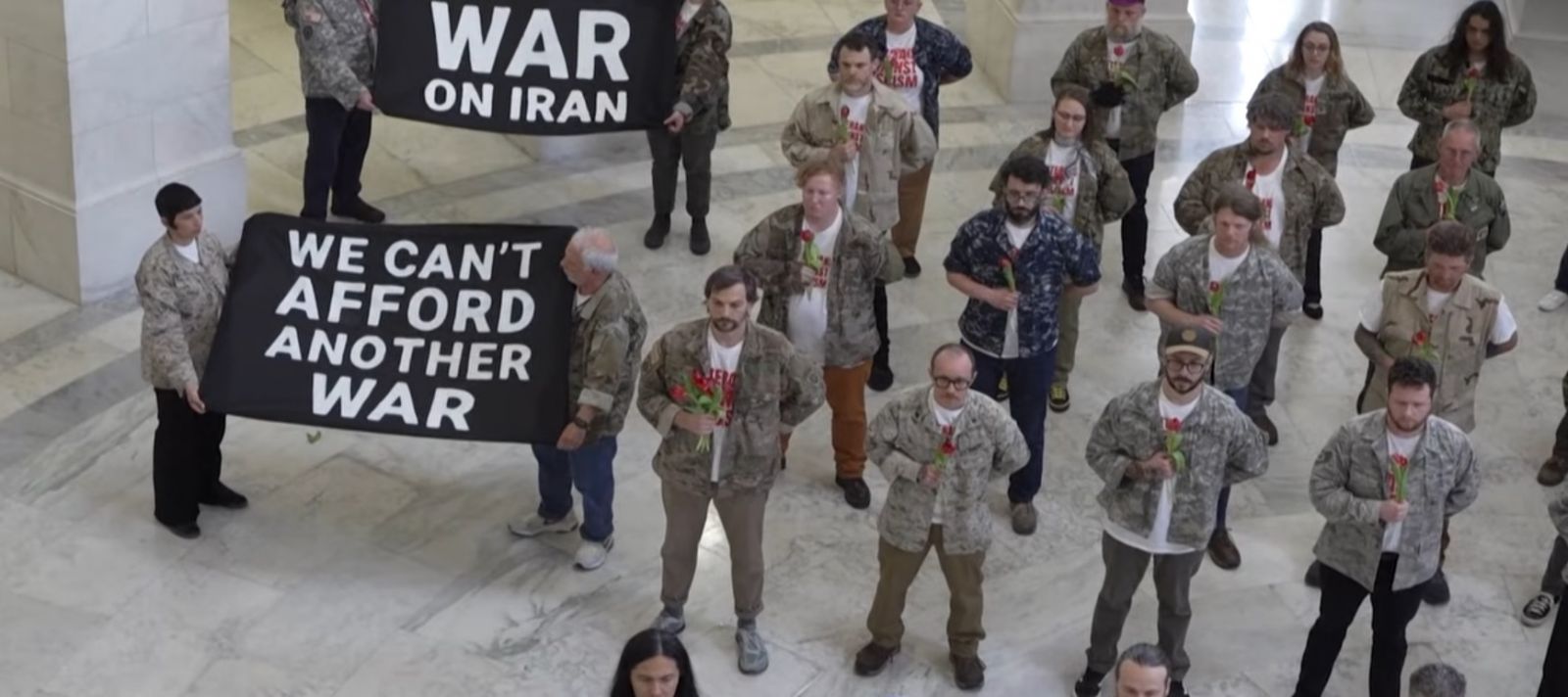 Mitingas buvo nukreiptas prieš karinę operaciją, kurią Jungtinės Valstijos vykdo Irane. Protestuotojai tvarkingai praėjo patikrą, bet po perspėjimų atsisakė nutraukti savo akciją. Pastato rotondos centre veteranai stovėjo laikydami raudonas tulpes, taip pagerbdami nuo amerikiečių smūgių žuvusius iraniečius.