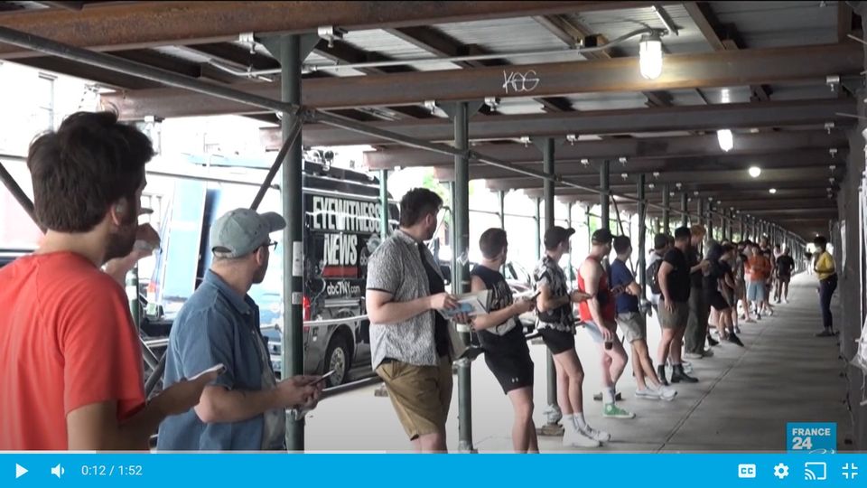 2022 m. birželio mėn. Niujorke, JAV beždžionių raupų protrūkio epicentre, ilga 20–40 metų vyrų eilė laukia vakcinos, kad apsaugotų save ir savo artimuosius nuo viruso. YouTube video STOP kadra.