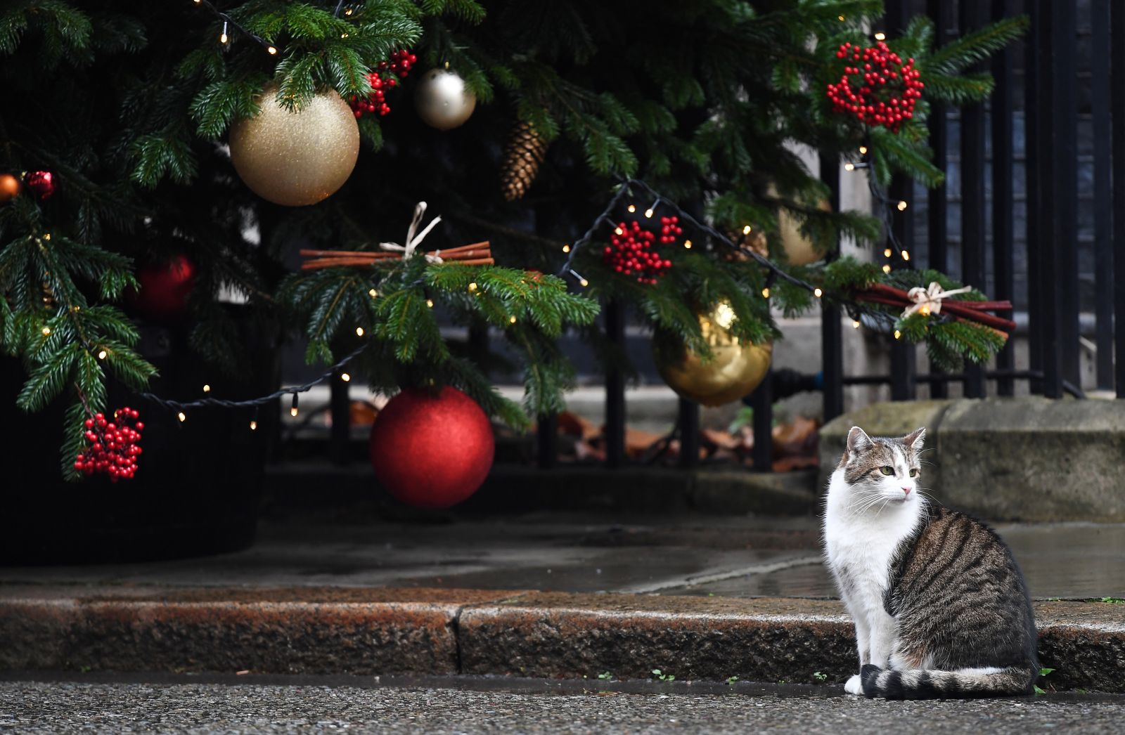 Spaudoje paskelbtoje gruodžio 10 dienos nuotraukoje garbingo amžiaus katinas Laris apžiūri Kalėdų eglutę prie įėjimo į D.Britanijos ministro pirmininko rezidenciją Dauningstryte.