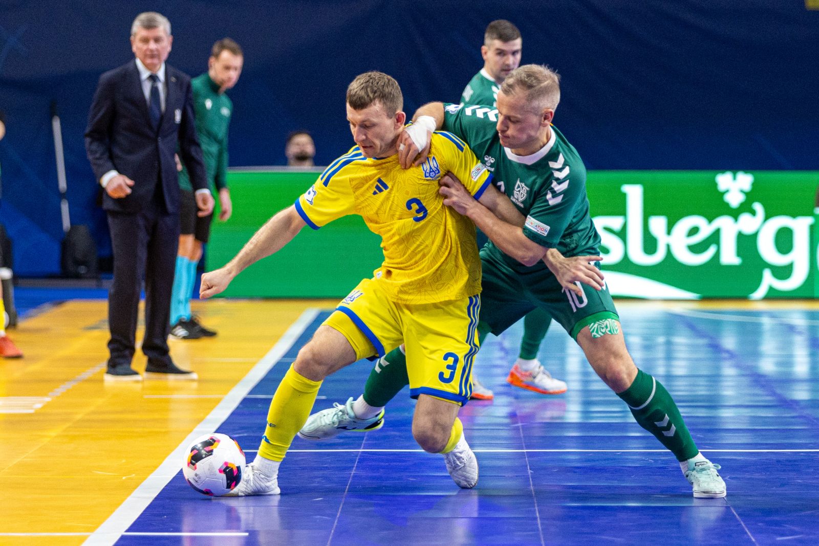 Ukrainiečiai nuo mačo pradžios įgijo iniciatyvą, kuri 7 min. virto Ihorio Černiavskio įvarčiu. 13 min. po kampinio įžaidimo rezultatą padvigubino Vladyslavas Perviejevas, 23 min. po greitos atakos pasižymėjo Ihoris Korsunas, o 33 min. ketvirtąjį varžovų įvartį pelnė Danylas Abakšinas. Rungtynių pabaigoje lietuviai visgi sugebėjo nudžiuginti sirgalius paguodos įvarčiu. 36 min. po rinktinės kapitono Justino Zagursko perdavimo jį įmušė Vladimiras Derendiajevas.