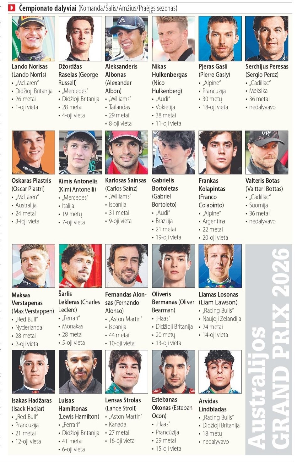 Sekmadienį Australijos „Grand Prix" lenktynėmis prasidės 77-asis „Formulės-1" sezonas. Čempiono titulą gins britas Laldas Norisas (Lando Norris), bet nuspėti, kas yra naujojo sezono favoritai, kol kas sunku.